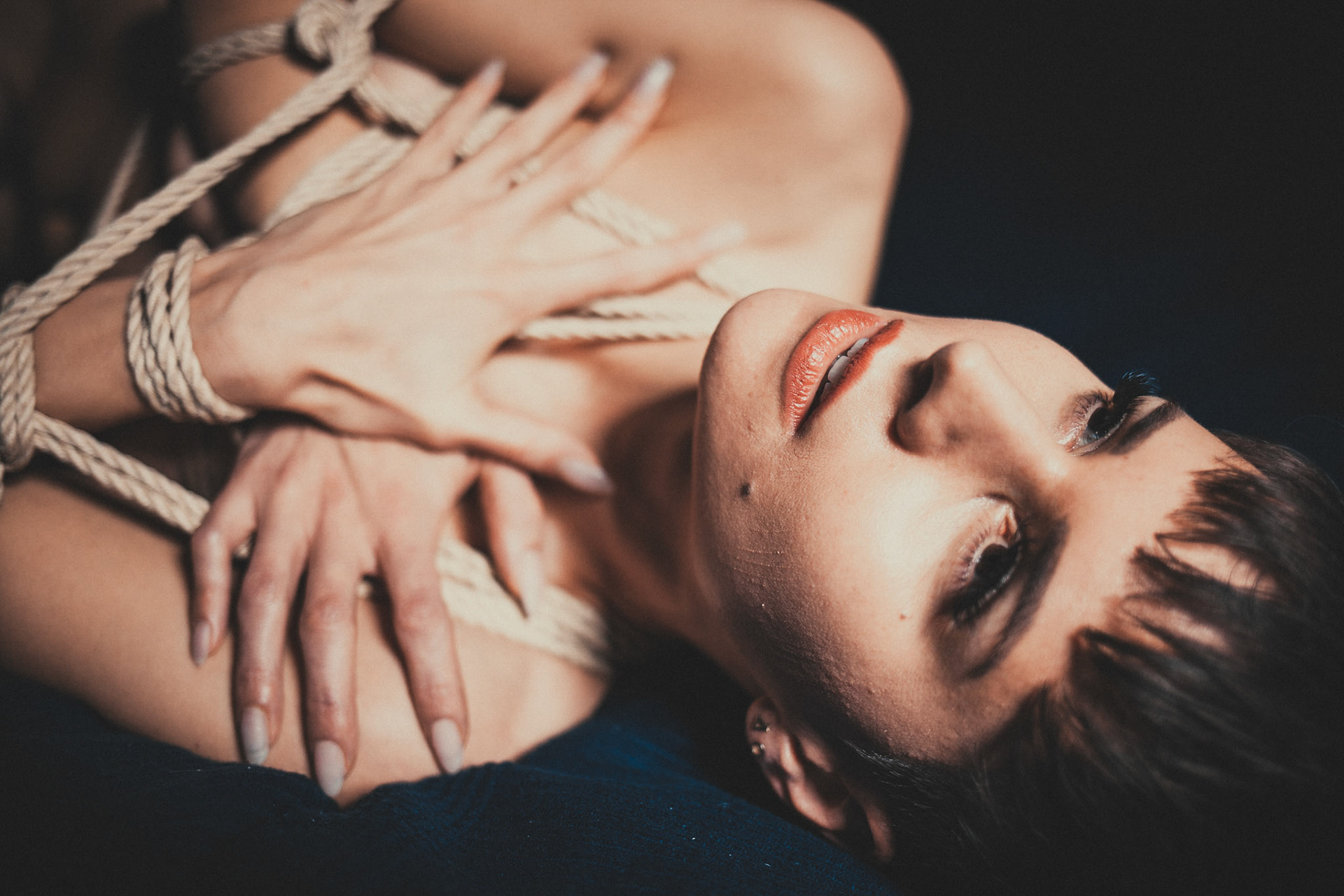 A dream of latex and rope, as she is bound to the sky